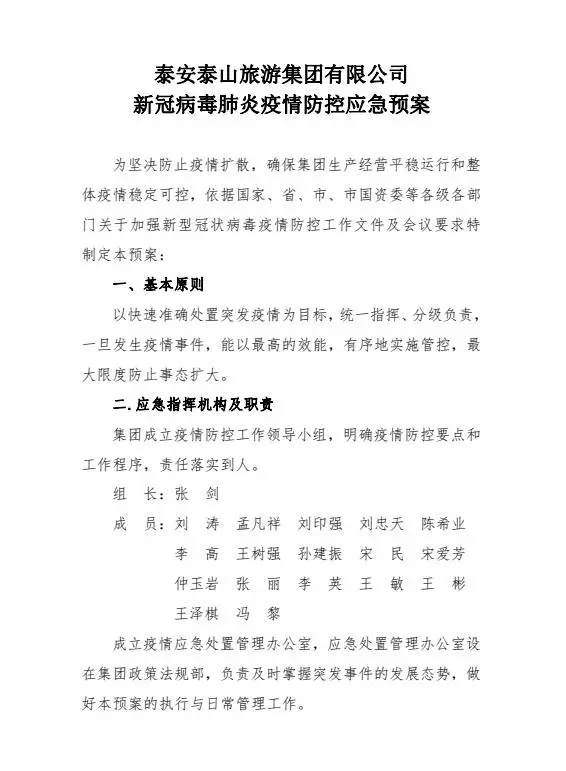 劉濤傳達了近日市相關部門關于做好當前疫情防控工作的通知要求。集團政策法規(guī)部部長馮黎宣讀了《泰山旅游集團疫情防控應急預案》。劉濤傳達了近日市相關部門關于做好當前疫情防控工作的通知要求。集團政策法規(guī)部部長馮黎宣讀了《泰山旅游集團疫情防控應急預案》。