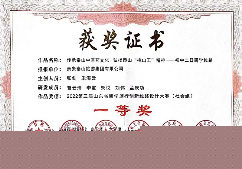 本次大賽嚴(yán)格按照統(tǒng)一報(bào)名參賽、網(wǎng)絡(luò)投票、專家評(píng)審、組委會(huì)審核等程序,最終確定了一等獎(jiǎng)10名,二等獎(jiǎng)20名,三等獎(jiǎng)30名,優(yōu)秀獎(jiǎng)50名。泰山旅游集團(tuán)參賽作品《傳承泰山中醫(yī)藥文化 弘揚(yáng)泰山“挑山工”精神》憑借規(guī)范性、豐富性、創(chuàng)新性、安全性、實(shí)用性,在數(shù)萬件參賽作品中脫穎而出,斬獲2022第三屆山東省研學(xué)旅行創(chuàng)新線路設(shè)計(jì)大賽一等獎(jiǎng)。